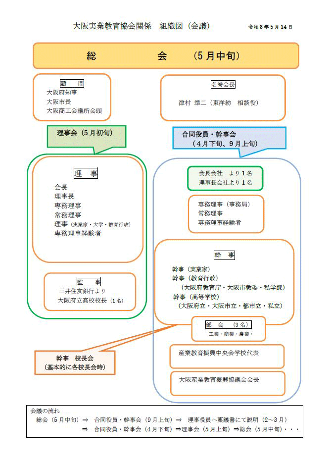 - 合同役員・幹事会は、全ての幹事(役員第9条-5の幹事)、部会の会長、産業教育振興中央会学校代表、大阪産業教育振興協議会長により構成する。